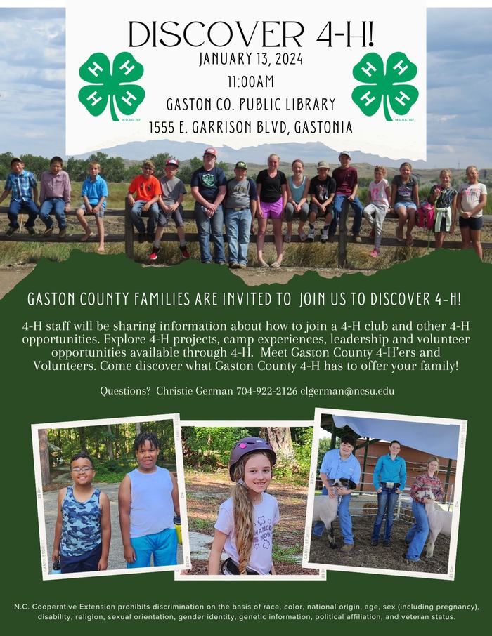 Join us on January 13, 2024 at 11 am at the Gaston County Public Library for Discover 4-H! 4-H staff will be sharing information about how to join a 4-H club and other 4-H opportunities. Explore 4-H projects, camp experiences, leadership and volunteer opportunities available through 4-H. Meet Gaston County 4-H’ers and Volunteers. Come discover what Gaston County 4-H has to offer your family!